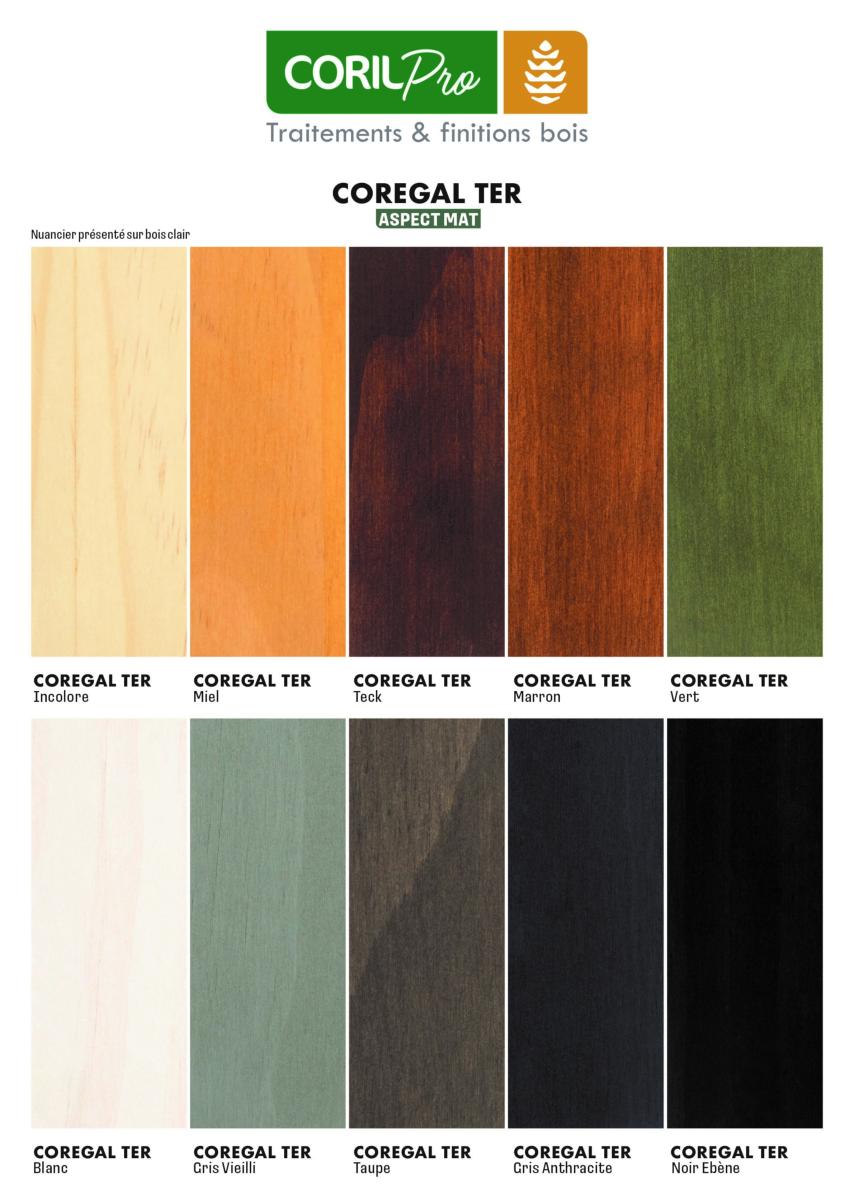 L’application de COREGAL TER sur bois déjà grisaillé assombrit la couleur naturelle du bois. Il peut être nécessaire de passer au préalable un dégrisant de type CORIDEGRIS'PRO.