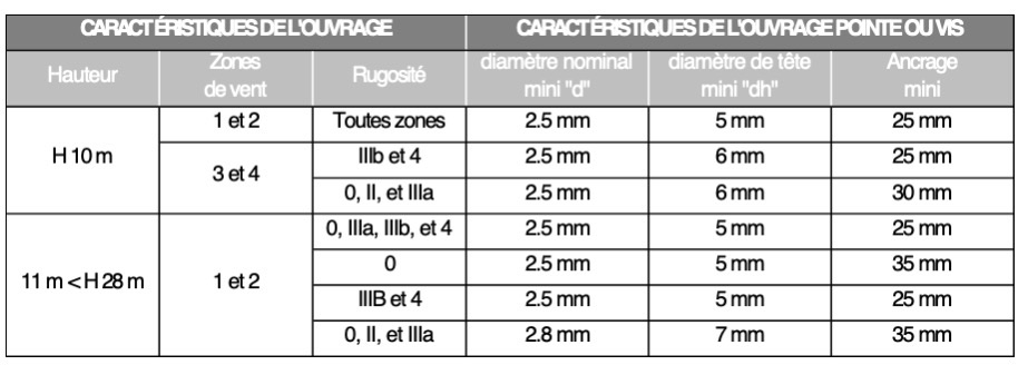 L’ancrage minimal des pointes ou vis et leur diamètre sont définis dans le tableau ci-dessous.