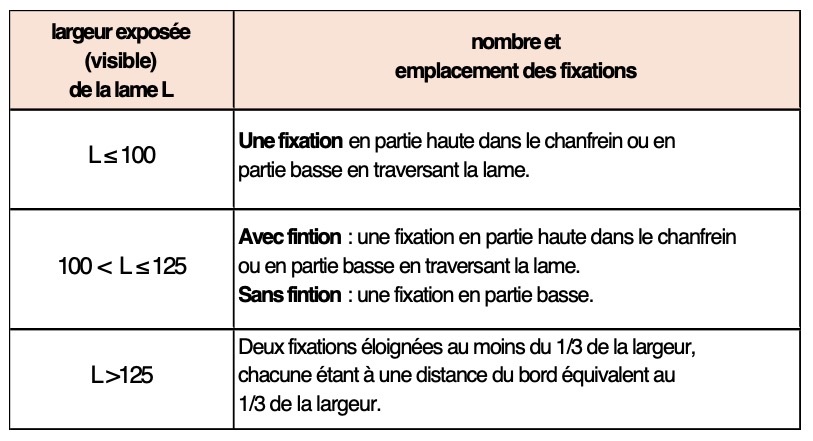 Lames ≤ à 125 mm de largeur utile : une seule fixation par appui dans la ligne de clouage.
